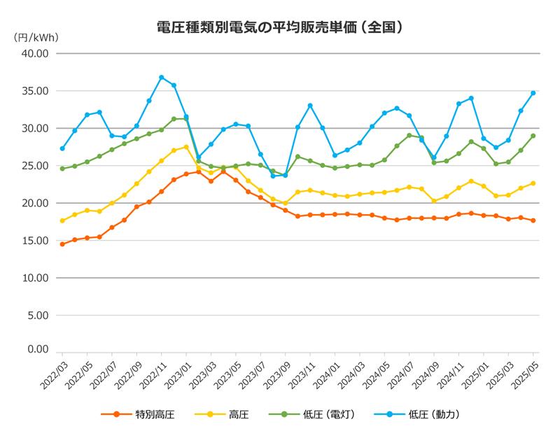 近年、物価高やエネルギーコストの上昇に伴い、企業が負担する電気料金は上昇傾向にあります。実際に、高圧電力の電気代は2025年5月時点で前年比+5.65%、低圧電灯、低圧動力で前年比+8~12%と上昇が目立ちます。